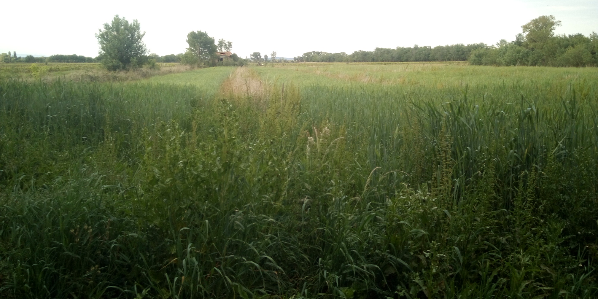 Les voisins ont des soucis. Leur blé jaunit, probablement pour cause de sécheresse. Le notre, pour l'instant se porte bien. Dans les parties proches de la haie d'arbres au sud, il atteint 1,6m de hauteur avec des épis bien vigoureux. La partie Nord, la plus sèche vu que la haie plantée n'a pas encore poussé, il demeure chétif : 1 m à 1,2 m de hauteur. Sur cette photographie on apperçois la bande enherbée qui servira pour les arbres fruitiers. Le blé lui-même comporte peu d'adventices.